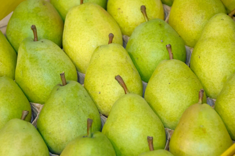 Frucht: Großfruchtige Winterbirne zum Frischverzehr und zur Konservierung, haltbar bis Januar. Etwas klobige Frucht, glatte und glänzende, grünlichgelbe bis orangerote Schale. Weißes, sehr saftiges, mildes, süßes und wohlschmeckendes Fleisch.